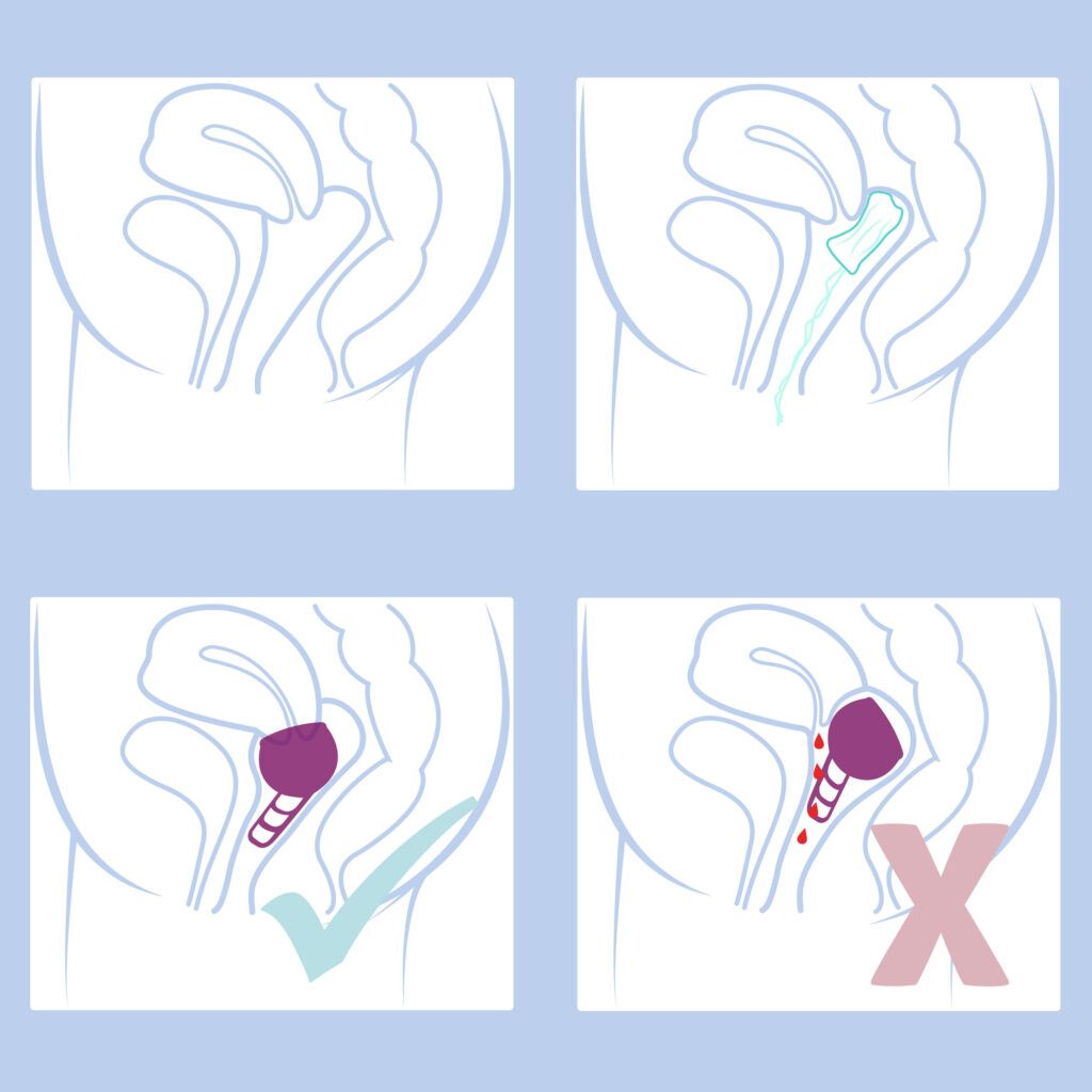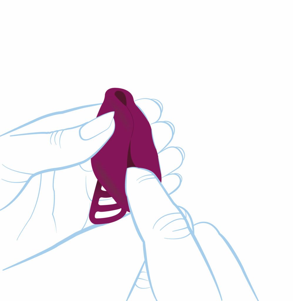Du kannst den Cup mit etwas Wasser befeuchten oder ein wenig wasserbasiertes Gleitgel auftragen (z.B.: Merula Lube). Führe den gefalteten Cup ein und achte darauf, dass sich der obere Rand innen wieder öffnet. Der Rest des Cups darf zerknautscht bleiben. Ist der Cup undicht, versuche die Position zu korrigieren. Der Cup muss nicht so tief wie ein Tampon eingeführt werden.
